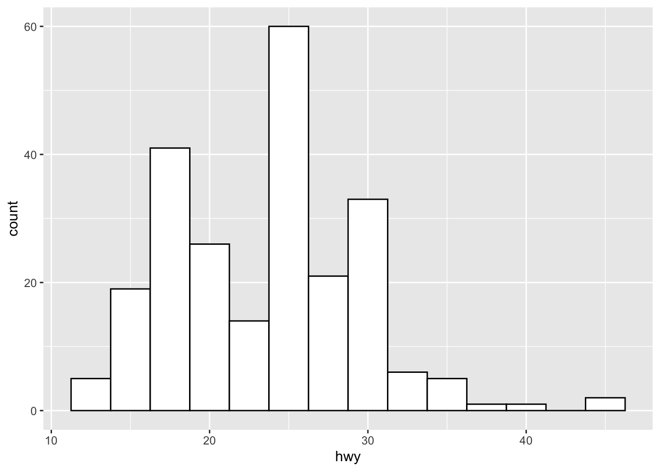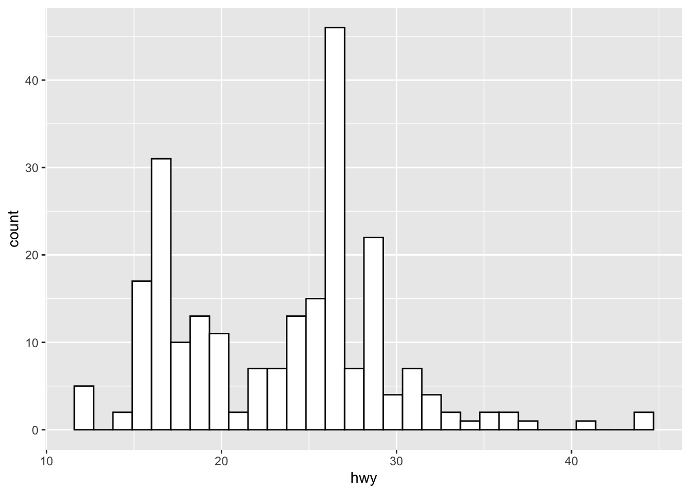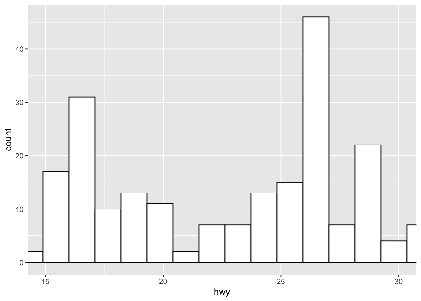 geom_histogram(mapping = aes(x = hwy), colour = "black", fill = "white", binwidth = 2.5)