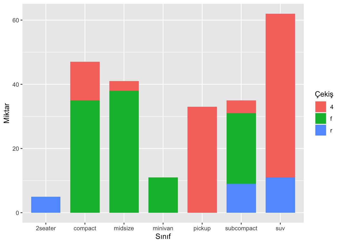 labs(x = "Sınıf", y = "Miktar", fill = "Çekiş")