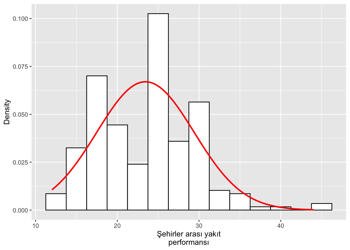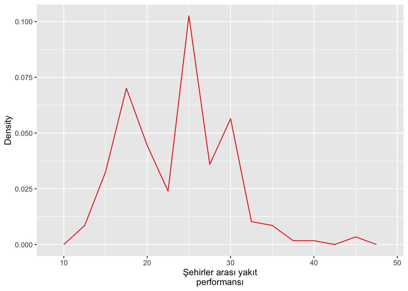 labs(x = "Şehirler arası yakıt\nperformansı", y = "Density")