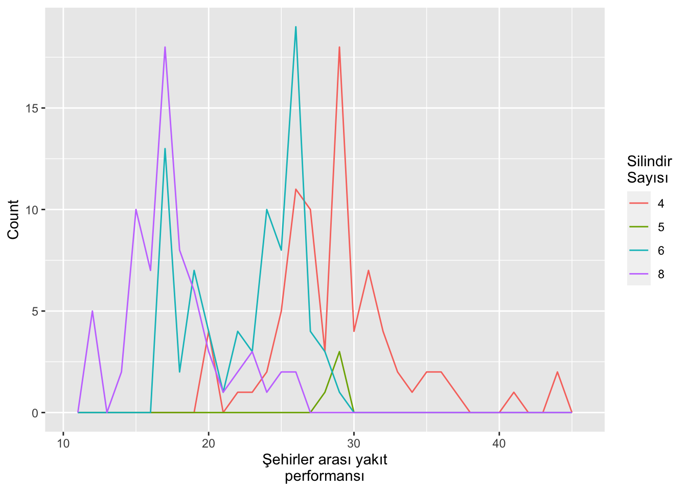 labs(x = "Şehirler arası yakıt\nperformansı", y = "Count", color = "Silindir\nSayısı")