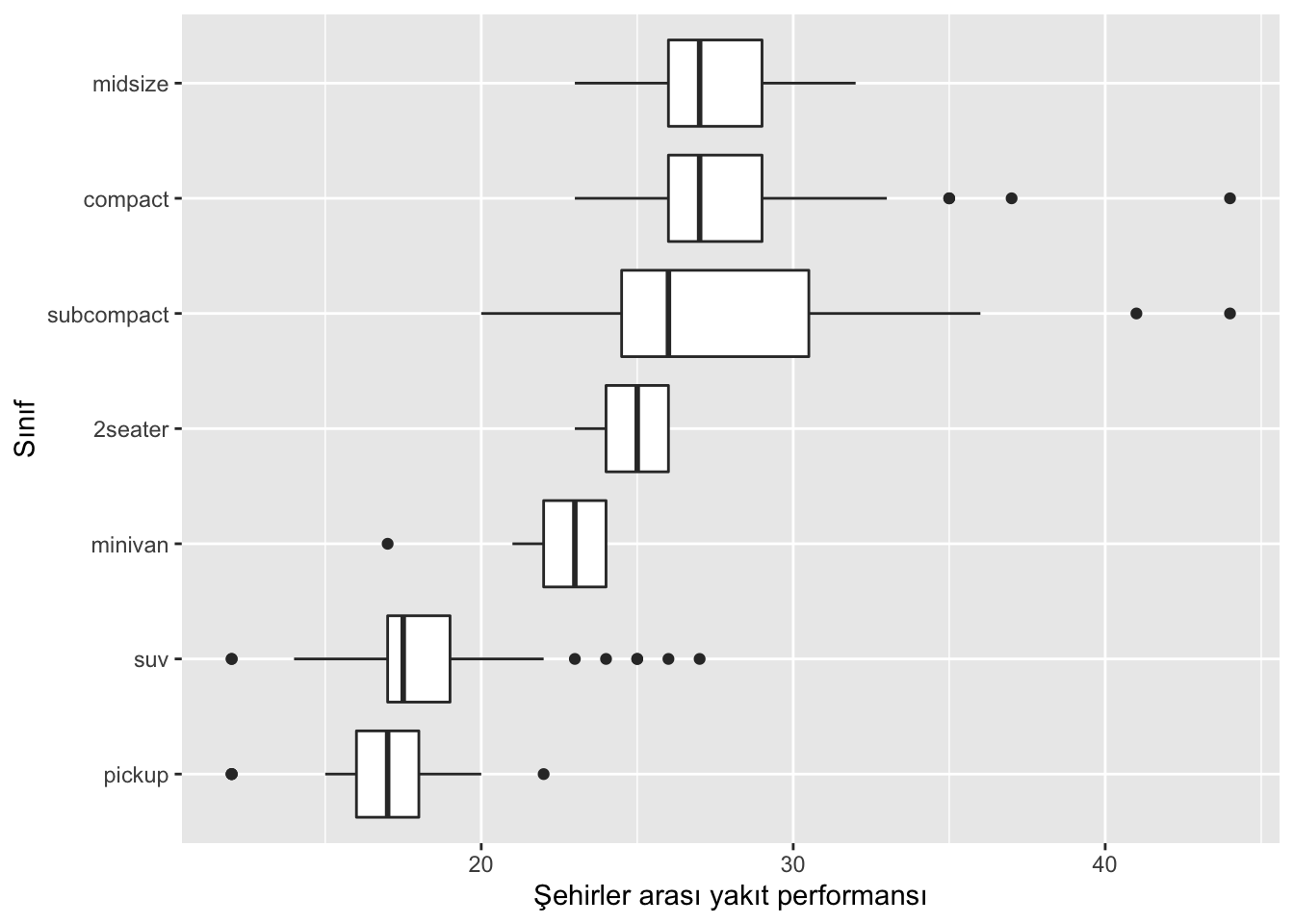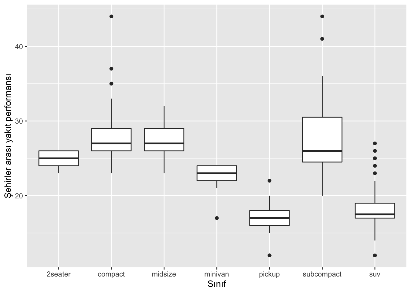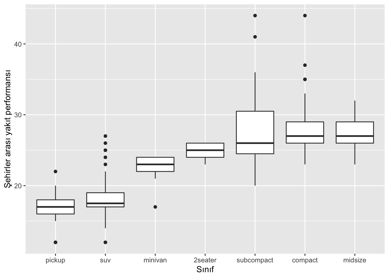 labs(x = "Sınıf", y = "Şehirler arası yakıt performansı")
