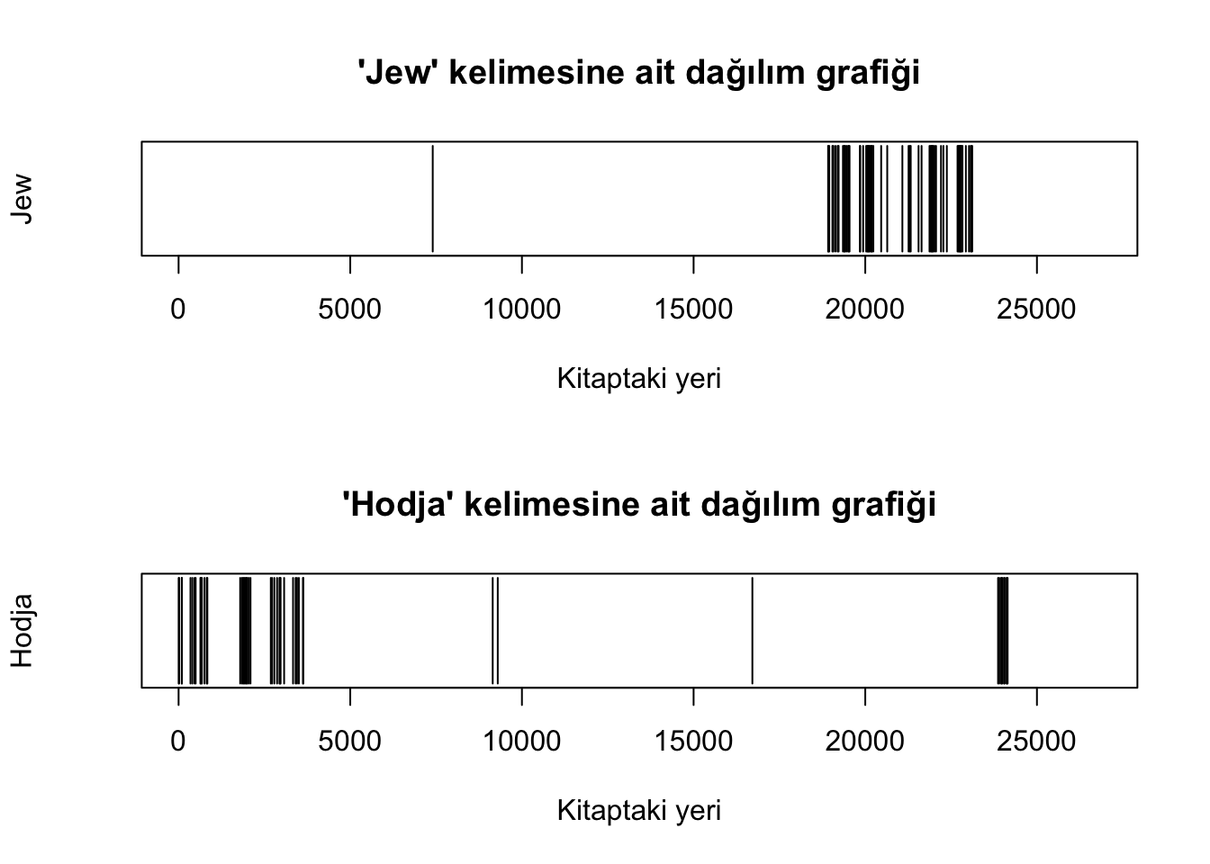 Son olarak herhangi bir kelimenin kitap boyunca dağılımını grafik olarak görelim. Bunun için öncelikle kitapta geçen kelime sayısınca indeks değer içeren bir vektör oluşturalım. İkinci olarak incelemek istediğimiz bir kelimenin mesela Jew kelimesinin indeks numaralarını tutan ikinci bir değişken oluşturalım. Üçüncü satırda kitaptaki kelime sayısınca NA değeri olan bir değişken oluşturduk ve dördüncü Jew kelimesinin indeks değerlerine “1” değerini atadık ve son olarak graği oluşturduk. Aynı incelemeyi hodja kelimesi için de yaptık ve iki grafiği alt alta ürettik: