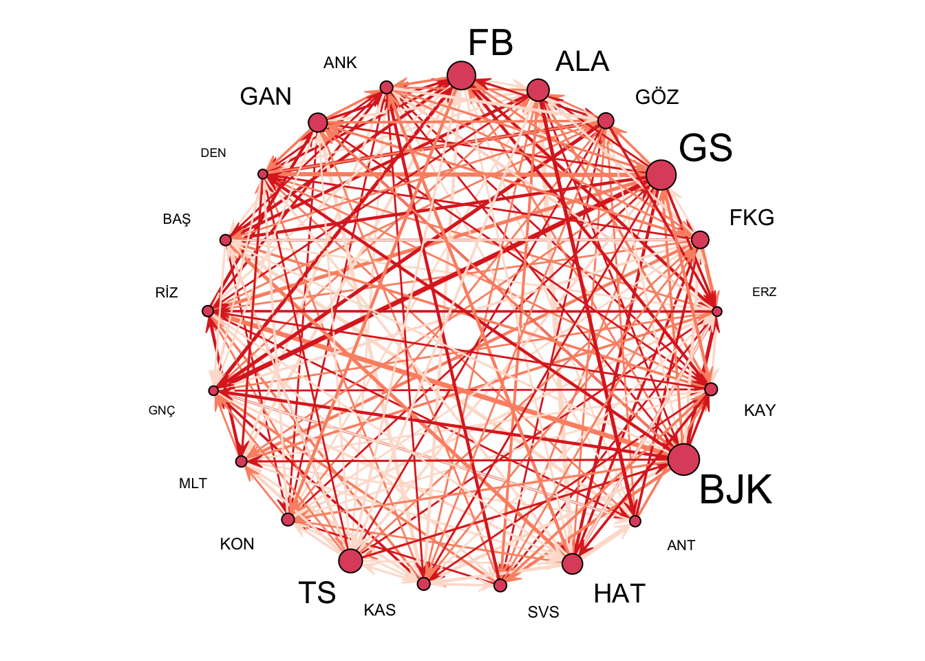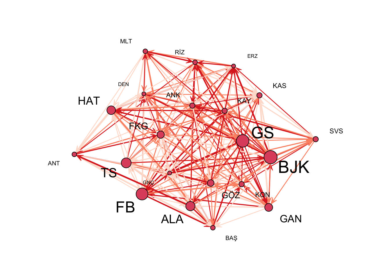 Bu grafikte gplot vertex ve takım ismi büyüklüklerini takımların galibiyet miktarına göre ayarlıyor. Üst sıralardaki takımlar daha büyük gsteriliyor. Takımlar arasındaki bağlantı net skora göre açıktan koyuya doğru değişiyor. Koyu kırmızı bağlantılar farklı galibiyetleri gösteriyor. Oklar galib takımdan mağlup takıma doğru gidiyor.
