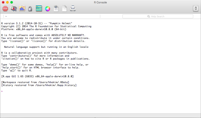 R’ı yükledikten sonra neymiş bu diye ilk açtığınızda belki hayal kırıklığına uğrayabilirsiniz. R çalıştığında programın versiyon bilgileri ve imlecin yanıp söndüğü bir komut giriş noktası içeren basit bir ekran karşınıza gelecektir. Kullandığınız işletim sistemine göre bazı farklılıklar içermekle birlikte aşağı yukarı aşağıda yer alan resimdekine benzer bir ekranla karşılaşacaksınız.