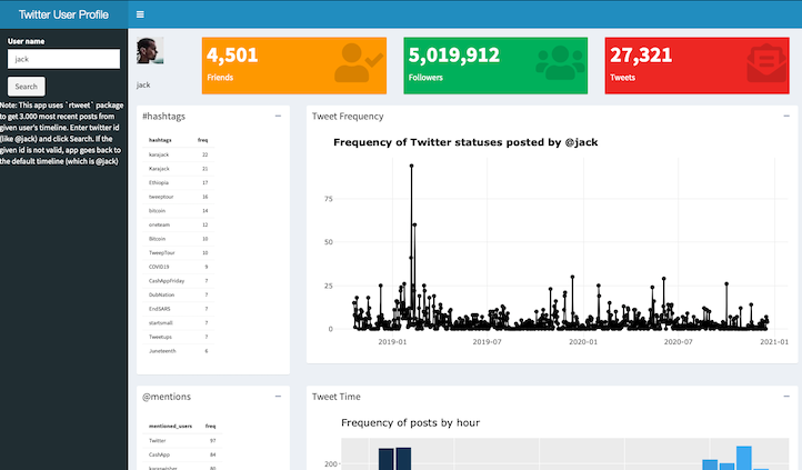 Uygulama, kullanıcı adı ile sorgulanan profilin timeline’ında bulunan son 3.000 tweet’ini rtweet ile indiriyor. En fazla kullandığı #hashtag ve @mention’ları listeliyor. Tweet trafiği, hangi saatlerde tweet attığı ve en fazla retweet yaptığı kullanıcıları grafik olarak gösteriyor.